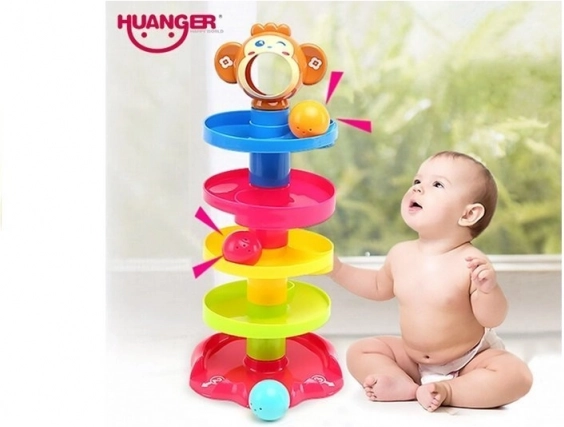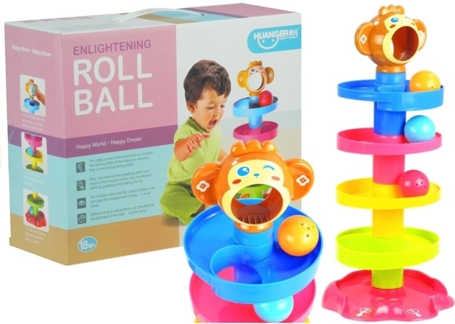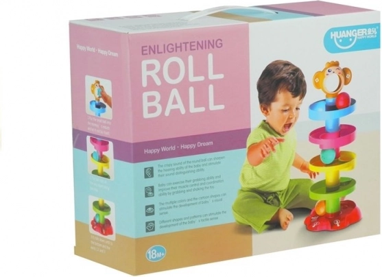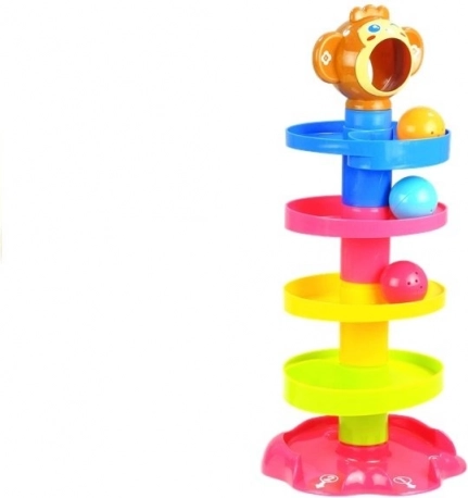Deze kleurrijke knikkertoren bestaat uit een stabiele basis, meerdere spiraalvormige verdiepingen en een schattige apenkop. Plaats een knikker in de opening bovenaan en kijk hoe hij over de spiralen rolt tot aan de uitgangen met de cijfers 1, 2 en 3. In de knikkers zitten rammelende elementjes die het gehoor stimuleren en kinderen helpen geluiden te onderscheiden.