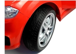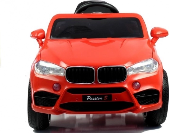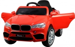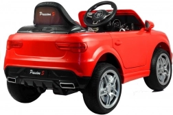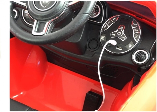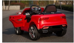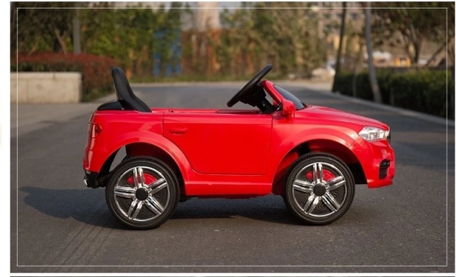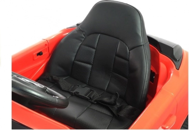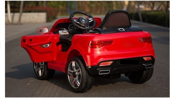 Het rode elektrische autootje is zorgvuldig ontworpen om eruit te zien als een echte luxe auto met details zoals lampen en openslaande deuren.