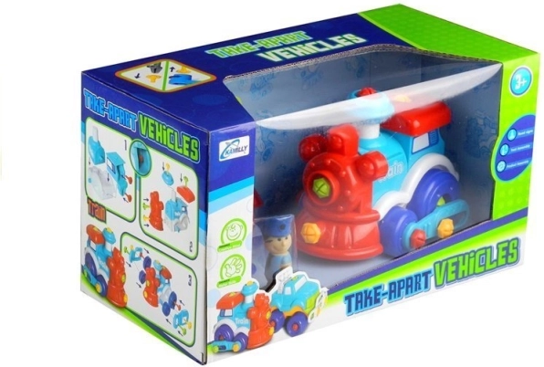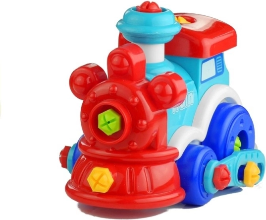Kleurrijk treintje met zwarte wielen en de mogelijkheid om uit elkaar te halen stimuleert de grenzen van de fantasie.