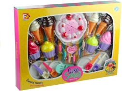 De set bevat 32 onderdelen om fantasieverjaardagsfeestjes te organiseren met taarten, ijsjes en cupcakes.