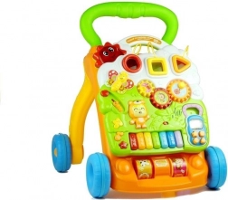 De interactieve 2-in-1 loopwagen helpt kinderen vol vertrouwen de eerste stapjes te zetten en biedt tegelijk veel speelplezier dankzij het afneembare paneel. Dit bevat een piano met 7 gekleurde toetsen, oplichtende geometrische vormen, tandwielen en extra knoppen met melodieën en geluiden. Het paneel is eenvoudig te verwijderen en afzonderlijk te gebruiken tijdens het spelen thuis, in het ledikant of onderweg. De welkomstzin is in het Engels.