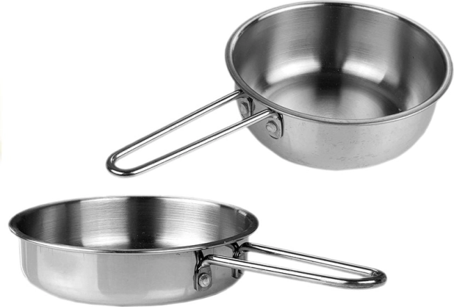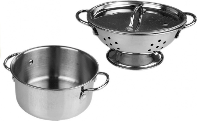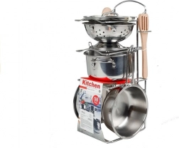De set bevat een vergiet, pot, pannen, houten keukengereedschappen en een standaard om alle onderdelen op te bergen.