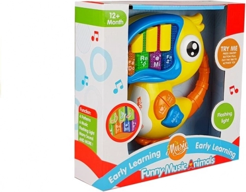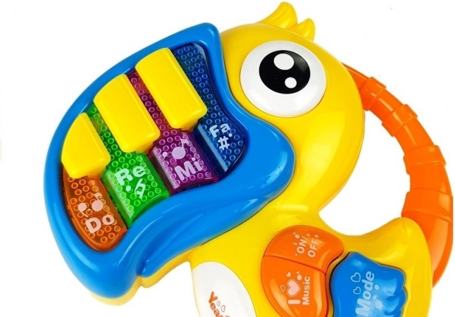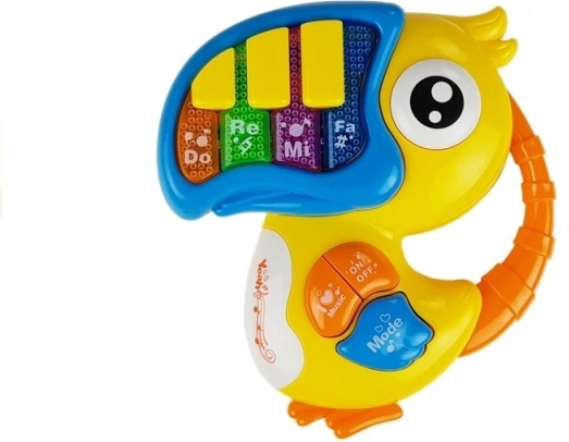 Interactieve piano in de vorm van een kleurrijk vogeltje is uitgerust met muzikale toetsen 'Do', 'Re', 'Mi' die elk kind boeien met hun kleurrijkheid en vrolijke ontwerp. Geluids- en lichteffecten helpen de zintuigen en verbeelding van het kind te ontwikkelen: