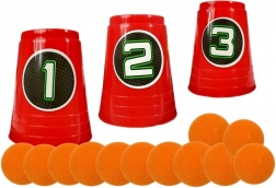 De verpakking bevat 12 zachte balletjes en verschillende genummerde bekertjes voor verbeterde precisie en strategisch spel. Het ontwerp in wit-oranje kleurstelling geeft het product een moderne uitstraling, terwijl de halfdoorzichtige houder het mogelijk maakt om gemakkelijk de beschikbare munitie te volgen.