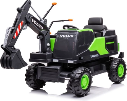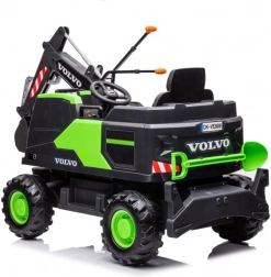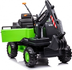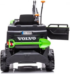 Deze graafmachine doet denken aan een geminiaturiseerde versie van een Volvo-bouwvoertuig met een groen-zwart design en gedetailleerde afwerking.