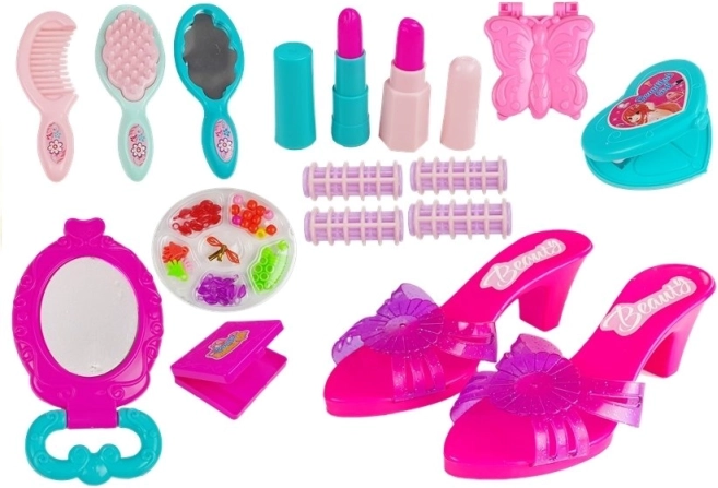 Een schattige kinderset in een praktisch koffertje die elke kleine fashionista blij maakt. Binnenin vind je roze sandalen met hak, een borstel en kam, een spiegeltje, krulrollers, kralen om sieraden te maken en imitatie-lipsticks. Het lichte koffertje met overzichtelijke opbergruimte en eenvoudige sluiting is ideaal voor op reis en voor het opbergen van alle accessoires.