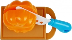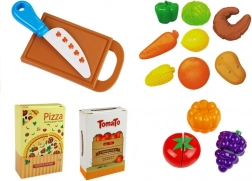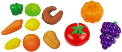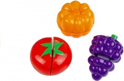 De set bevat verschillende accessoires zoals een winkelwagentje, voedselattributen in de vorm van tomaat, wortel of pompoen, en ook een scanner en kassa.
