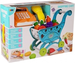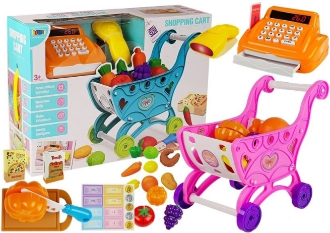 De set bevat een winkelwagentje, kassa, voedselattributen en andere accessoires voor realistisch spel.