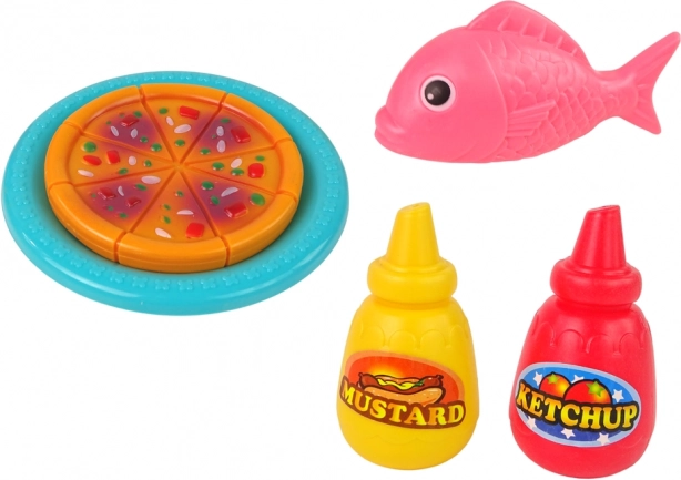 De set bevat plastic speeltjes zoals een vis, kip en pizza, die de speelmogelijkheden vergroten.