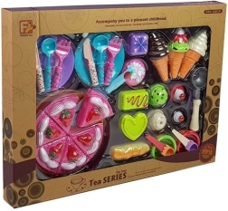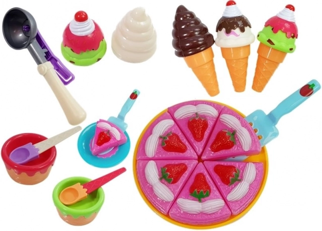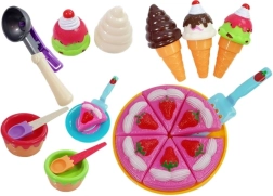 - taart (6 stukken), 1 groot bord, 2 kleine bordjes, 3 ijshoorntjes, 2 kommetjes, 5 verwisselbare ijsbollen, ijslepel, 2 kleine lepeltjes, taartschep, 5 vormpjes met “lekkernijen”