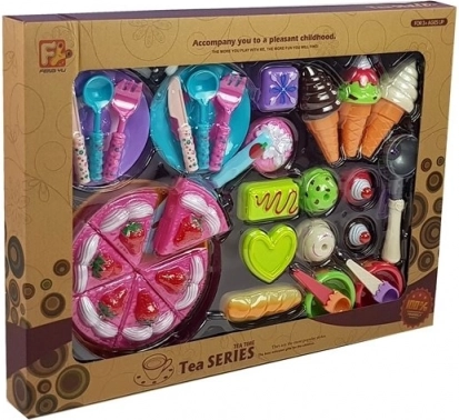 Uitgebreide set voor het spelen van patisserie en huishouden, ideaal voor elke kleine fijnproever. Bevat een taart van 6 stukken, ijshoorntjes, kommetjes, borden, bestek en vormpjes. Dankzij de vrolijke kleuren en rijke uitrusting stimuleert het de fantasie, fijne motoriek en sociale interactie. Gemaakt van veilig plastic, met CE-certificaat, geschikt vanaf 3 jaar.