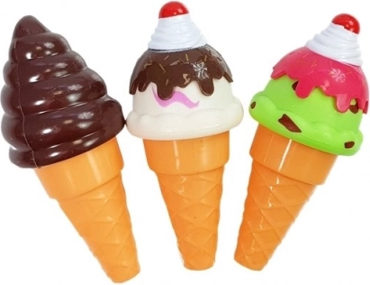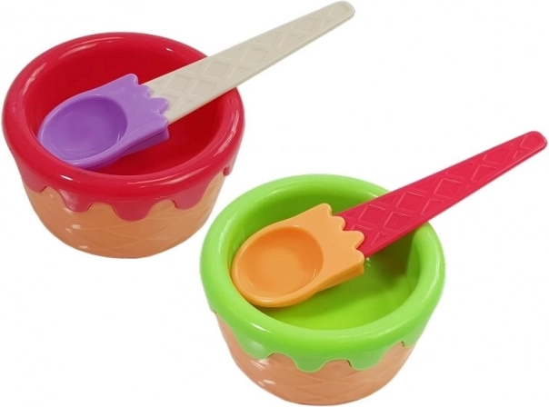 Kleurrijke hoorntjes, kommetjes en een ijslepel maken het mogelijk om smaken te mixen en ijscoupes naar eigen fantasie te maken.