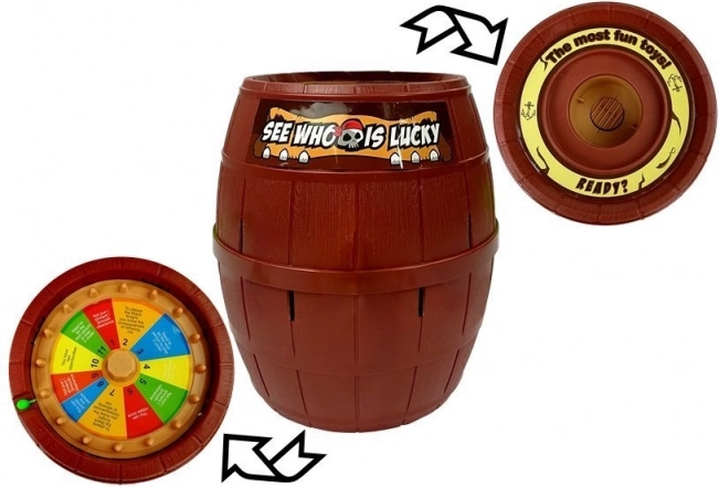 - Piraat, vat met openingen, 16 gekleurde zwaardjes, geluksrad met kleuren
