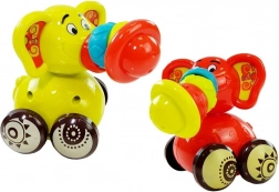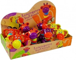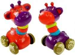 Deze kleurrijke speelgoedjes combineren geliefde dieren met kleine wagentjes, zodat kinderen spelenderwijs hun vaardigheden kunnen ontwikkelen. De elastische slurf van de olifant en de nek van de giraf zitten aan een elastiek, kunnen worden uitgerekt en rammelen prettig bij beweging. De olifant heeft drie rubberen ringetjes en een plastic hoedje op de slurf, de giraf is versierd met ringen in rood, turquoise en groen.