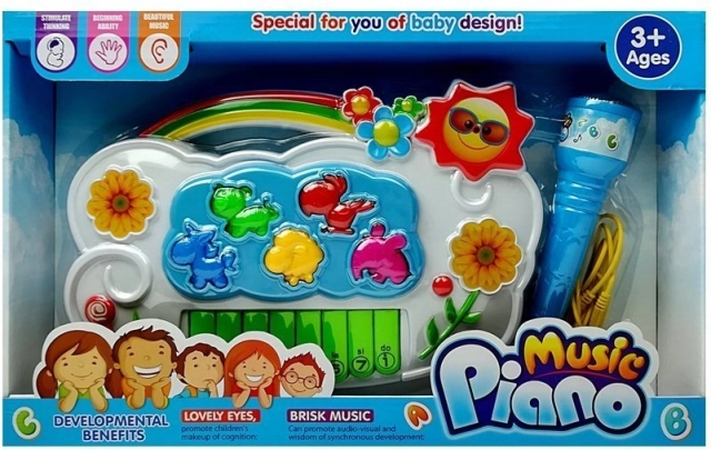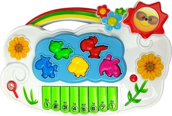Het pianootje heeft 8 toetsen en vijf dieronderdelen (kat, papegaai, paard, schaap, olifant) die op de juiste posities geplaatst worden – een geweldige vorm van plezier en training van de fijne motoriek. Het speelgoed biedt keuze uit 2 talen (Engels, Spaans) voor speels leren van woordjes en geluiden.