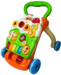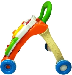 Ondersteun de eerste zelfstandige stapjes van je kleintje op een veilige en speelse manier. De kleurrijke loopwagen heeft een stevige duwbeugel, een stabiele basis en wielen met siliconen banden voor een soepelere en beter gecontroleerde rit. Het interactieve paneel met een piano met 5 toetsen, tandwielen, openende deurtjes en een schattig konijntje stimuleert zicht, gehoor en fijne motoriek.