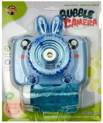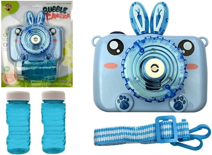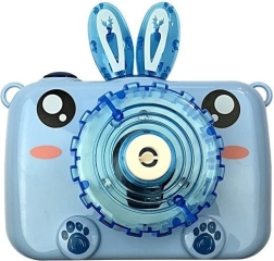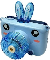 Mooie blauwe camera die zeepbellen blaast. Ideaal cadeau voor speelplezier bij warm weer. De camera heeft ook licht- en geluidseffecten. Giet gewoon de vloeistof erin, druk op de knop en je kind ziet hoe er een heleboel zeepbellen uit de cameralens komen. Perfect voor allerlei feestjes, verjaardagen of gewoon als speelgoed voor je kind. In de set zit een draagriem zodat hij comfortabel om de nek gedragen kan worden als een echte camera. Door de oortjes aan de bovenkant lijkt hij op een konijntje.