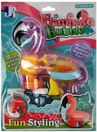 Deze leuke set voor het maken van bellen bestaat uit een flamingo-vormig pistool en twee flesjes met vervangende oplossing. Schroef eenvoudig de dop van het flesje los, verwijder de beveiliging en schroef deze in het pistool. Druk op de trekker en prachtige, kleurrijke bellen beginnen uit het pistool te komen.