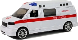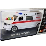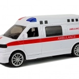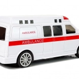 Witte uitvoering met rode accenten en het opvallende opschrift AMBULANCE, gedetailleerde wielen en ramen – precies als een echte ambulance, die uitnodigt tot reddingsspel.