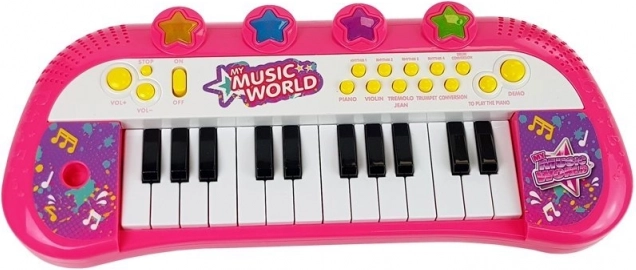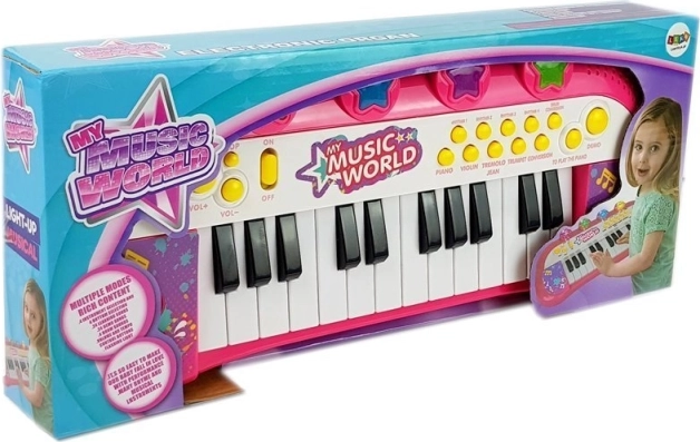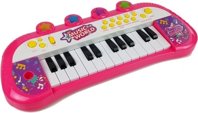 Deze piano heeft 24 toetsen. Het meisjespianino valt op door een oogstrelende roze‑paarse kleurstelling en door lichtgevende sterren in 4 verschillende kleuren. Het orgel is gemaakt van gecertificeerd, robuust kunststof van de hoogste kwaliteit en is daarom voorzien van een CE-certificaat. Boven de zwart-witte toetsen bevindt zich een rij kleurrijke verschillende knoppen die geweldige effecten en functies activeren.