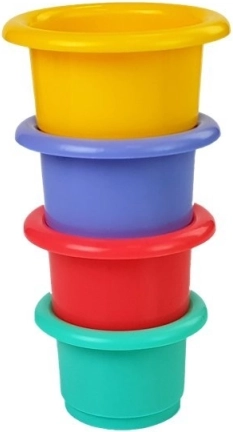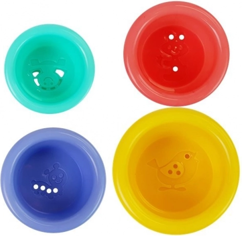 De set bevat 4 kleurrijk verschillende emmers die gestapeld kunnen worden. Aan de onderkant zijn verschillende gaatjes aangebracht waardoor verschillende waterstromen kunnen worden geobserveerd. Elke emmer is versierd met ingegraveerde vormen van dieren zoals een vogeltje, worm, konijn en schildpad. Dit speelgoed is niet alleen leuk, maar helpt kinderen ook kleuren te leren en hun motorische vaardigheden te ontwikkelen.