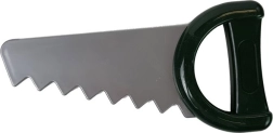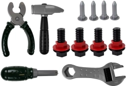 Zaag, hamer, tang, schroevendraaier, sleutel, schroeven, moeren en platen om te schroeven – alles van duurzaam kunststof zonder scherpe randen.