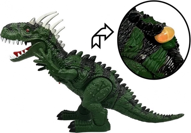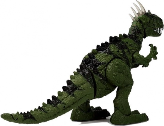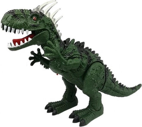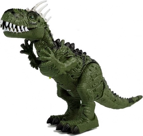 Ga terug naar het dinotijdperk met een realistische tyrannosaurus die zelfstandig vooruit beweegt, zijn hoofd draait, de voorpoten beweegt, de bek opent en sluit en daarbij authentieke brulgeluiden maakt. Het groene lichaam met zwarte details, opvallende tanden en schubben met meer-kleurige verlichting versterken de indruk van een echte prehistorische jager.