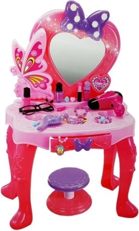 Roze kinderkaptafel met een opvallende hartvormige spiegel is de ideale plek voor fantasierijk spel. Deze betoverende set bevat accessoires zoals een föhn, borstel en nep-cosmeticaproducten.