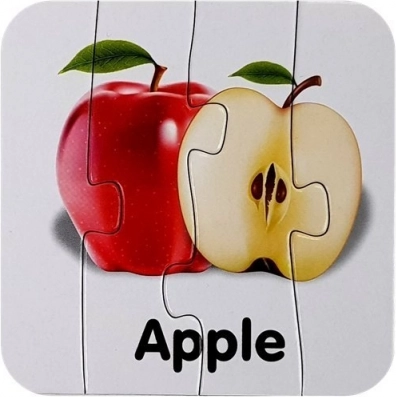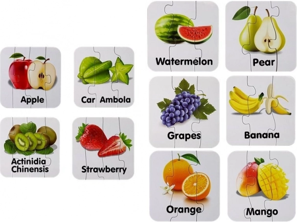Elk puzzelstuk toont een stuk fruit en de Engelse benaming (bijv. Apple, Banana, Orange). Kinderen onthouden de woordjes dankzij de combinatie van beeld en tekst.