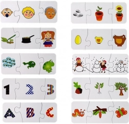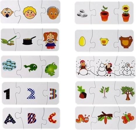 Elke minipuzzel is ontworpen als zelfcontrolerend – alleen de juiste combinatie past. Zo oefenen kinderen op natuurlijke wijze sorteren, ordenen, geheugen en woordenschat. De set omvat verschillende kennisgebieden: natuur, dieren, planten, cijfers en letters.