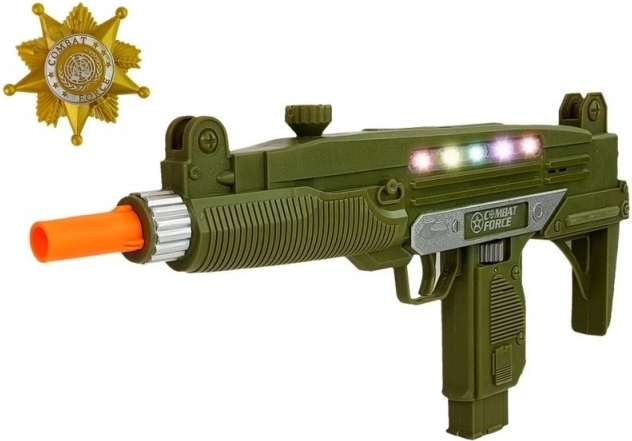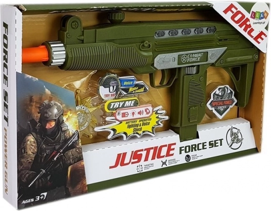 De grote kinderpistool in donkergroen licht op met LED’s, maakt realistische schietgeluiden en activeert een trileffect wanneer de trekker wordt overgehaald. De set bevat ook een badge, zodat de kleine held zich eenvoudig kan veranderen in een lid van speciale eenheden. Het speelgoed is perfect als aanvulling op een carnavalskostuum en voor dagelijks avontuurlijk spel.