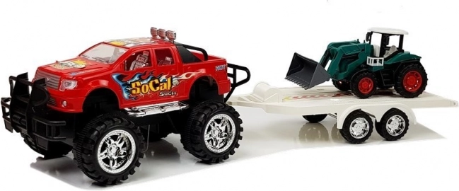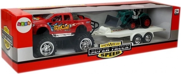 De complete set, met auto, aanhanger en graafmachine, is verpakt in een aantrekkelijke doos met een transparant venster.