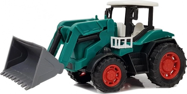 Groene graafmachine met voorlader en beweegbare bak, ideaal voor het nabootsen van bouwwerkzaamheden.