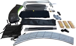 Modulaire onderdelen van verzinkt staal en kwaliteitsstoffen zorgen voor snelle montage en stabiel gebruik. Materialen weerstaan corrosie en wisselende weersomstandigheden.