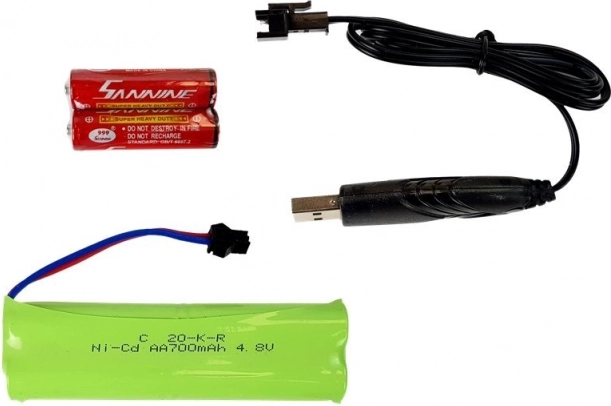 Inclusief 4,8 V 700 mAh-accu en USB-kabel voor gemakkelijk opladen. Tot 15 minuten rijtijd na circa 200 minuten opladen.