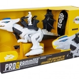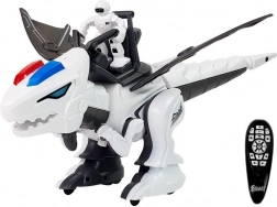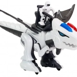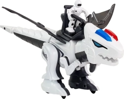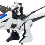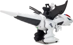 De robot is gemaakt van duurzaam kunststof in een wit-zwarte kleurencombinatie met rode en blauwe details. Het design omvat beweegbare delen, zoals vleugels en poten, waardoor de dinosaurus dynamische bewegingen kan maken. Alles wordt aangevuld met een ruiterfiguur die de dinosaurus “bedient”.