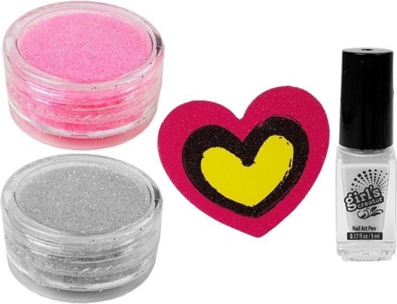 De set bevat alle essentiële tools, zoals transparante lak, een nagelvijl in de vorm van een hart, glitter in roze en zilver en zelfklevende sjablonen.