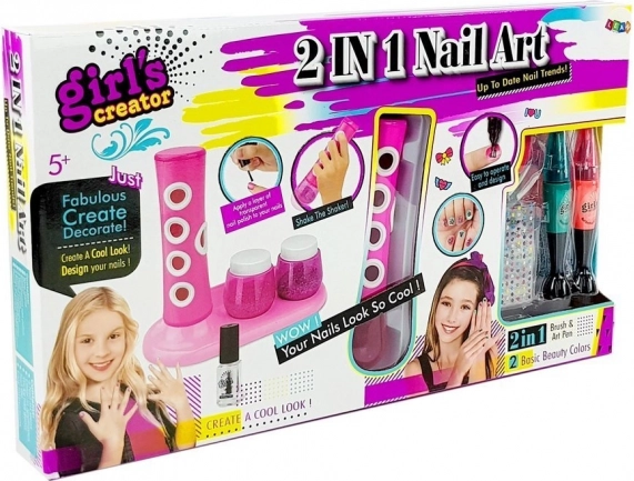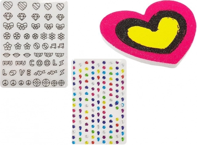 De set bevat heldere lak, twee glittercontainers, gekleurde stickers in de vorm van harten, bloemen en andere interessante vormen die elke ontwerp een creatieve touch geven.