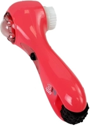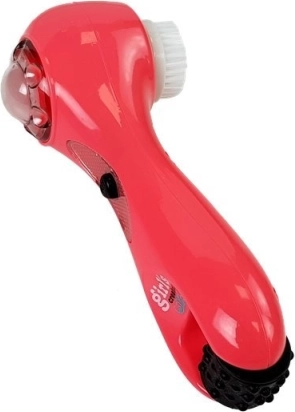 Rode handmassageapparaat met borstelopzetstuk en massagekoppen voor persoonlijke verzorging.