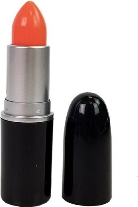 Mooi verpakte lippenstift in een koraalkleurige tint in een zwart etui met een zilveren streep.