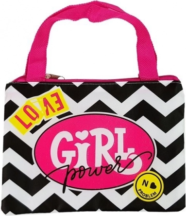 Klein tasje met zwart-wit zigzagpatroon en roze opschrift 'Girl Power'.