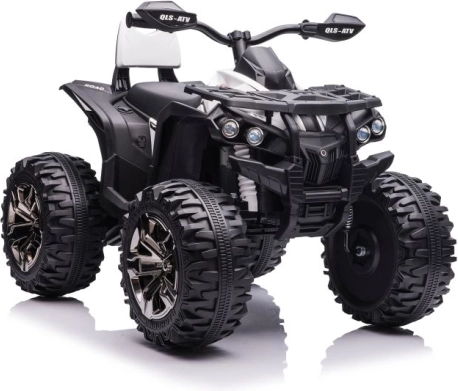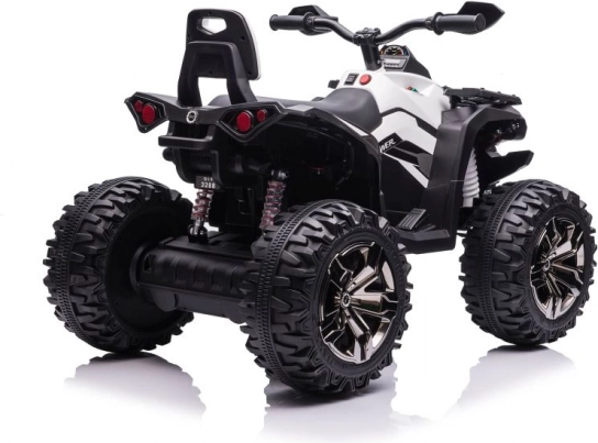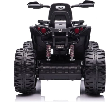 De quad is uitgerust met grote, robuuste wielen die stabiliteit en veiligheid bieden bij het rijden op oneffen terrein.