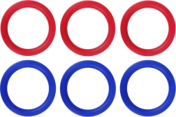 Zes duurzame kunststof ringen in twee kleuren (rood en blauw) maken het mogelijk om met meerdere kinderen en volwassenen tegelijk te spelen.