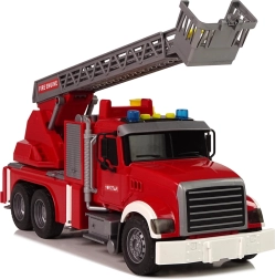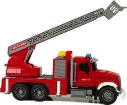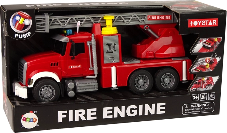 De vrachtwagen heeft in het bovenste deel van de cabine een gele opening waardoor je gemakkelijk water naar binnen kunt gieten. Als je er een paar keer op drukt, zie je water uit de slang stromen die op de daarvoor bestemde plaats is gemonteerd. Jouw kleine helper is klaar voor actie! Druk op de knop aan de bovenkant van het reservoir en kijk hoe het water begint te stromen! Hij kan kleine brandjes blussen. De ladder wordt met een zwengel omhoog gebracht.