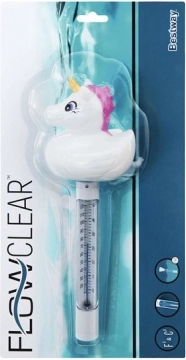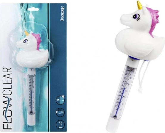 Geniet van zwemmen op de ideale temperatuur met de drijvende zwembadthermometer BESTWAY in de vorm van een eenhoorn. De duidelijke schaal toont waarden in graden Celsius en Fahrenheit en de ABS-constructie garandeert weerstand tegen water en zon. Dankzij het lusje met koord bevestig je de thermometer eenvoudig aan de rand van het zwembad.