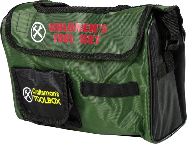 De duurzame tas met handvat en schouderriem houdt alle onderdelen bij elkaar. Gemakkelijk mee te nemen en helpt orde te houden in het kindergereedschap.
