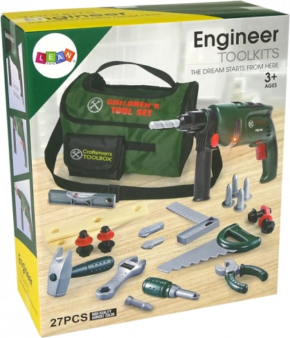 De set biedt tot 27 onderdelen die fijne motoriek, logisch denken en creativiteit spelenderwijs ontwikkelen. In de verpakking zitten ook 3 verwisselbare boortjes, schroeven, moeren en houten plankjes om schroeven te oefenen. Alles voldoet aan de normen CE en EN 71, voor veilig speelplezier.