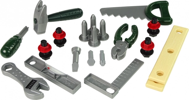 Zaag, hamer, schroevendraaier, sleutel, combinatietang, schroeven, moeren en plankjes – alles wat een kleine klusser nodig heeft om fijne motoriek en fantasie te oefenen.