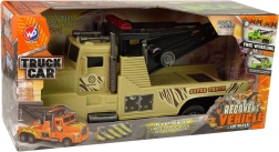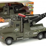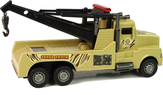 Robuuste kunststof takelwagen op schaal 1:10 met werkende lier en haak, perfect voor kleine liefhebbers van bouw en wegen. Dankzij de wrijvingsaandrijving schiet hij vooruit na het terugtrekken, met de beweegbare kraan en kabel sleep je andere speelgoedjes weg en het militaire design stimuleert fantasierijk spel. Geschikt voor kinderen vanaf 3 jaar, voldoet aan CE en EN71.