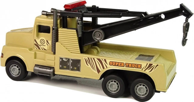 Deze gedetailleerd uitgevoerde “Super Truck” takelwagen is ideaal voor actiescènes op de kinderbouwplaats of bij “verkeersongevallen”. De achterkraan met uitschuifbare kabel en haak wordt bediend met een praktische zijslinger, zodat een kind eenvoudig een ander autootje kan vastmaken en verplaatsen naar het “slagveld” of de parkeerplaats.